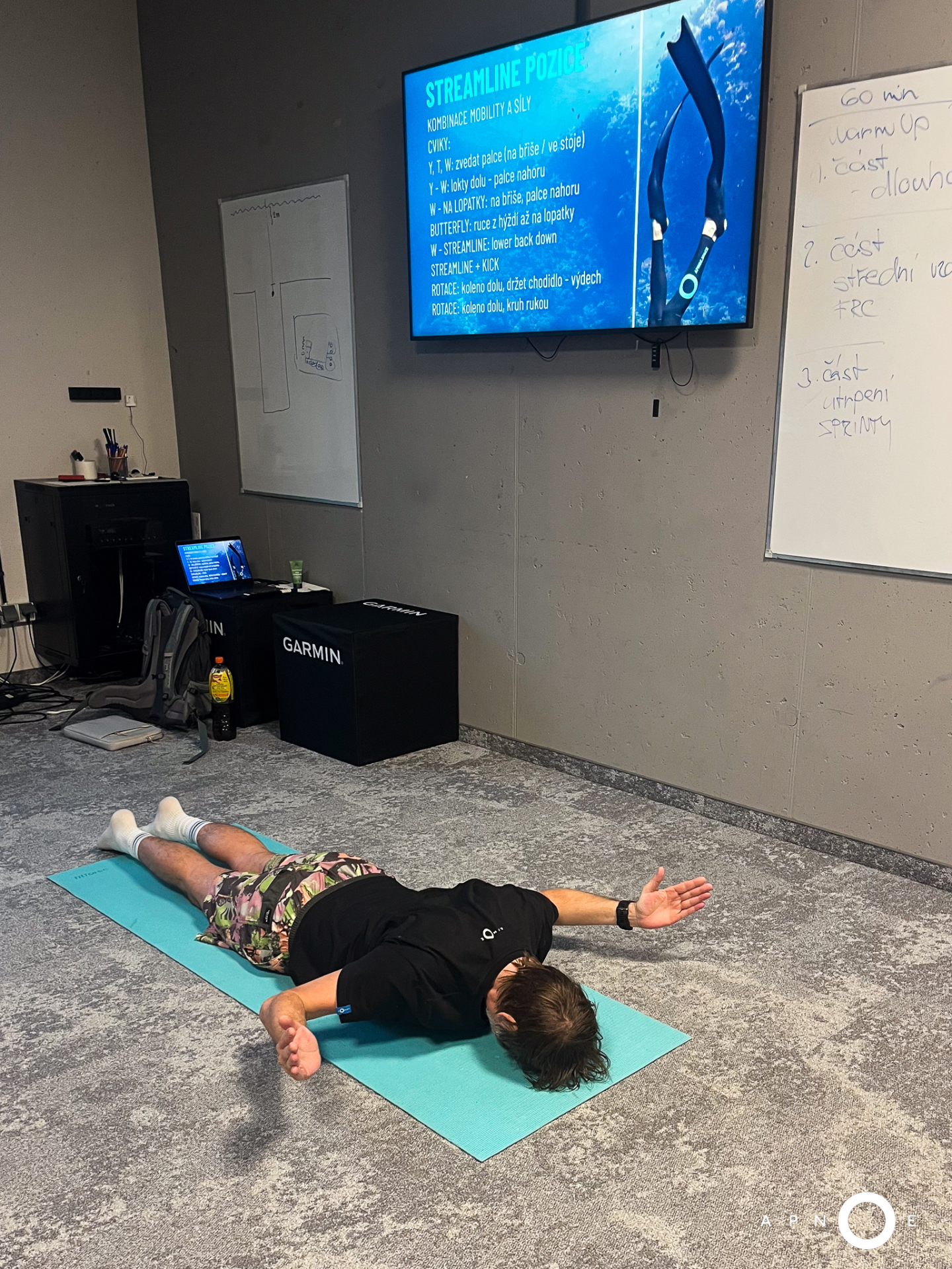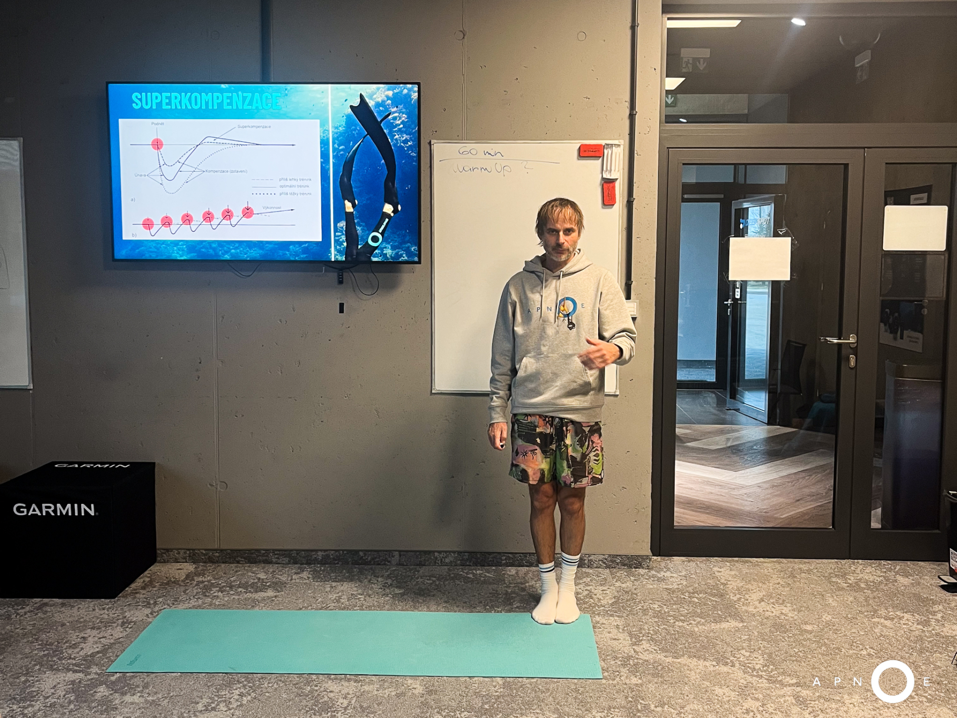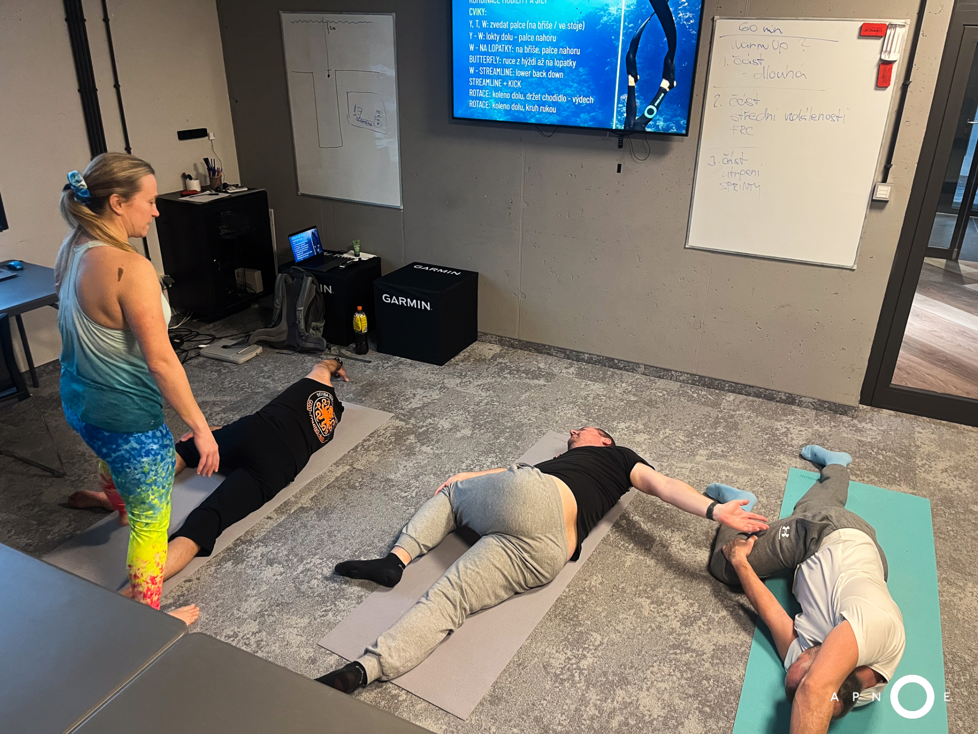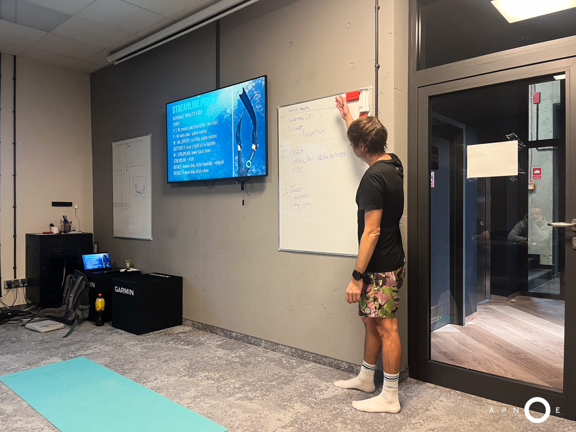 Po celé tři dny probíhala spousta specializovaných workshopů a teoretických přednášek zaměřených na vše, co je pro potápění do hloubek potřeba a co naše účastníky zajímalo. Samozřejmostí byl detailní rozbor techniky u všech čtyř disciplín, equalizace, koncept tréninku a jak se doma a v bazénu na hloubky připravit, nebo dýchání a realita hyperventilace. Každý den jsme představili spoustu nových cviků, zaměřených na mobilitu páteře, ramen a lopatek, fasciální strečink, nebo jen cvičení pro dobrou pohodu. Bylo toho opravdu hodně.